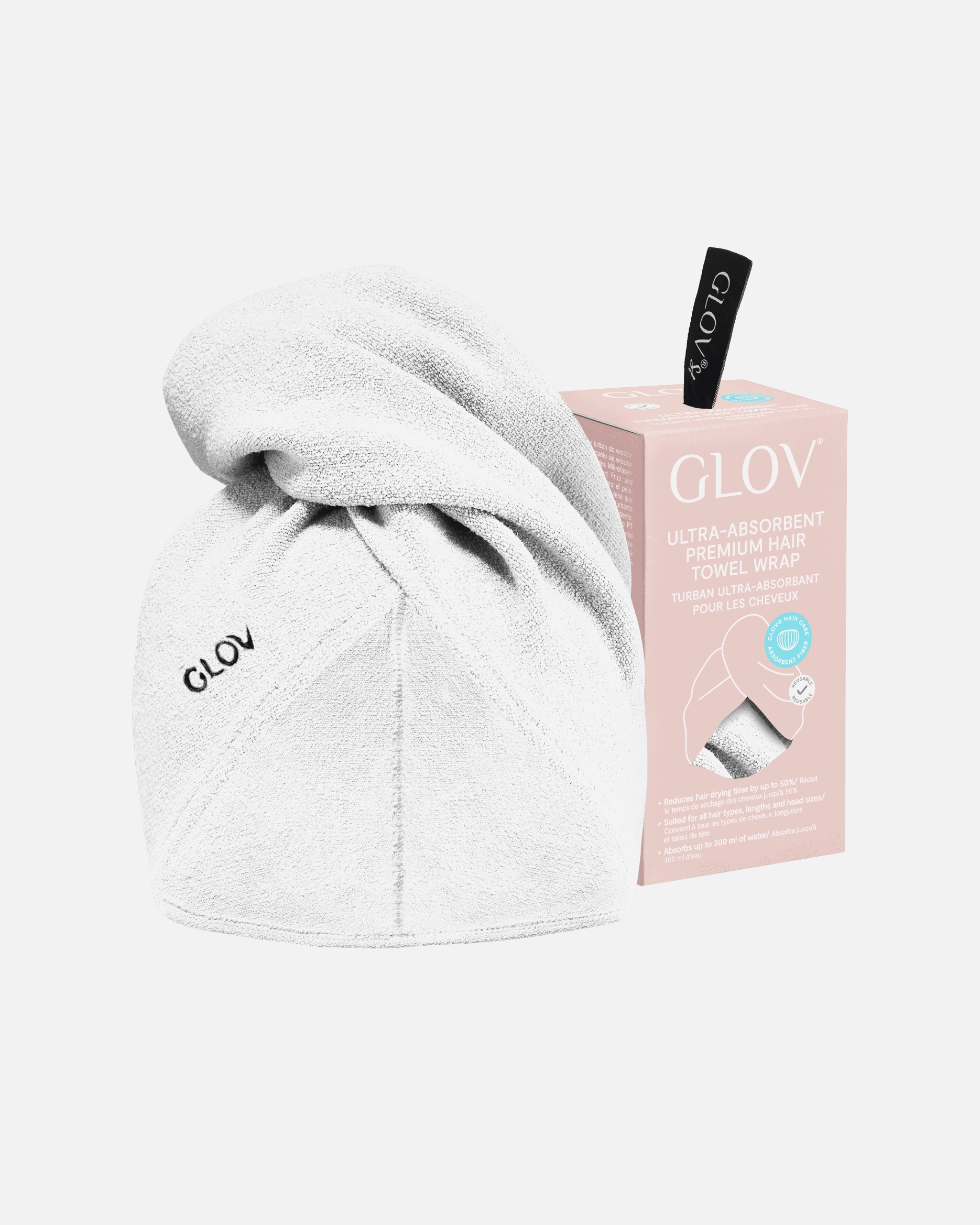 - Toalla: hecha de microfibra ultra suave, la toalla de GLOV seca tu cabello rápida y delicadamente, reduciendo el daño por fricción.