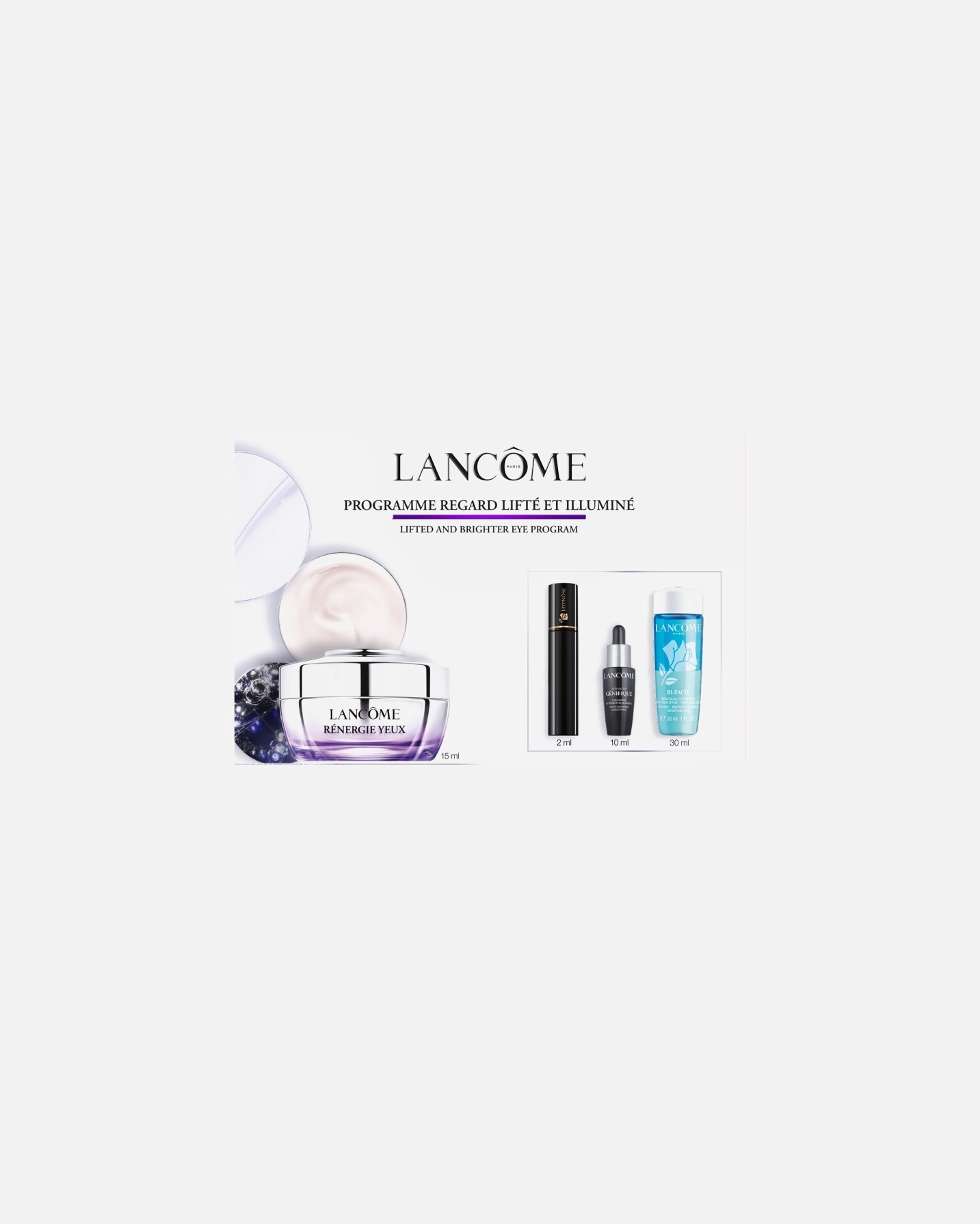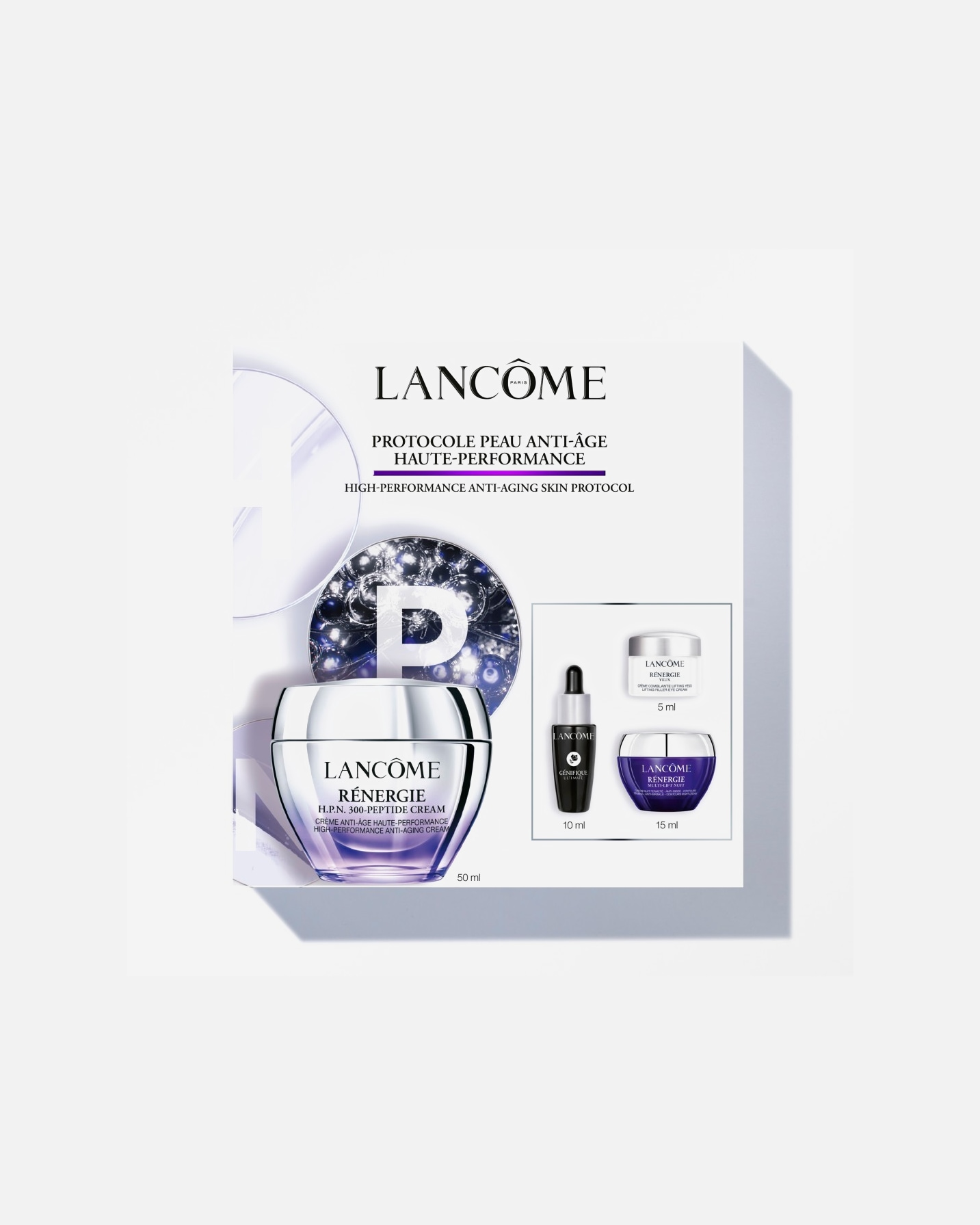Lancôme, fundada en 1935, es referente en tratamiento antiedad. La línea Rénergie Multi Glow reúne cremas y sérums orientados a firmeza, luminosidad y uniformidad del tono.